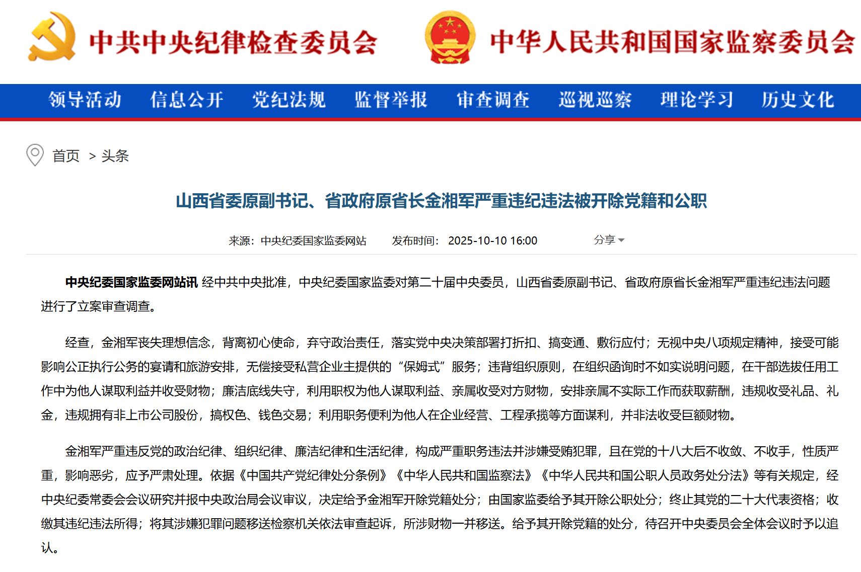 據央視新聞10月10日消息,經中共中央批準,中央紀委國家監委對二十屆中央委員金湘軍嚴重違紀違法問題立案審查。調查發現其喪失理想信念,多項紀律均違反,涉嫌受賄犯罪,影響惡劣。依據相關規定,決定給予金湘軍開除黨籍和公職處分,終止其二十大代表資格,收繳其違紀所得,將其涉嫌犯罪問題移送檢察機關依法審查起訴。