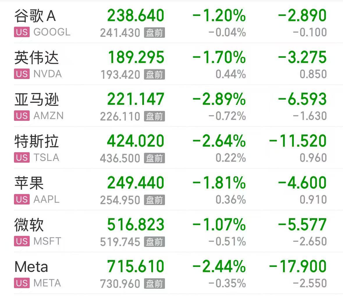 大型科技股普跌,亞馬遜、特斯拉、Meta跌超2%,谷歌、英偉達、蘋果、微軟跌超1%。
