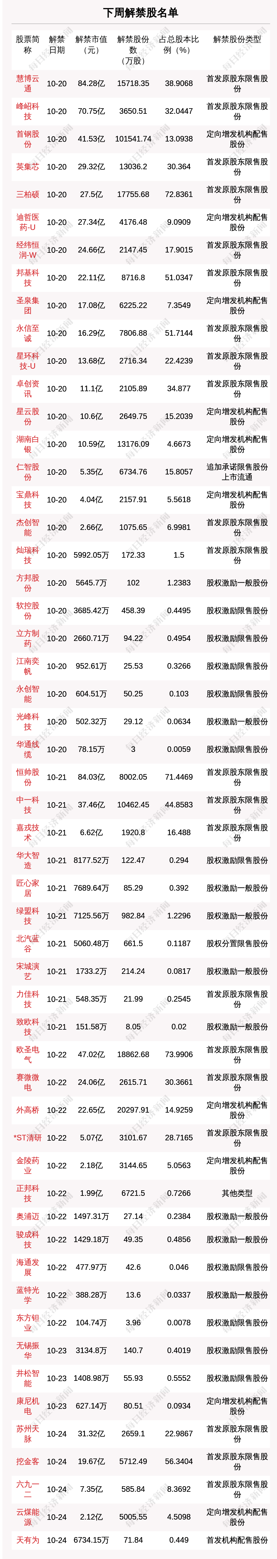 具體到個股,下周解禁市值排名前3的是慧博云通、恒帥股份、峰岹科技,解禁市值分別為84.28億元、84.03億元、70.75億元。