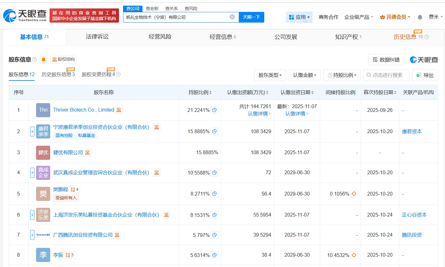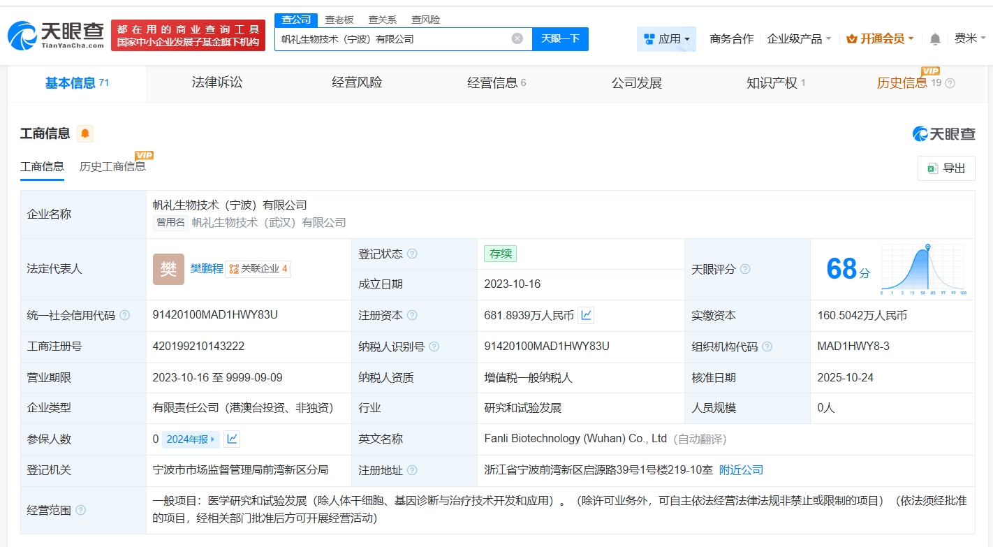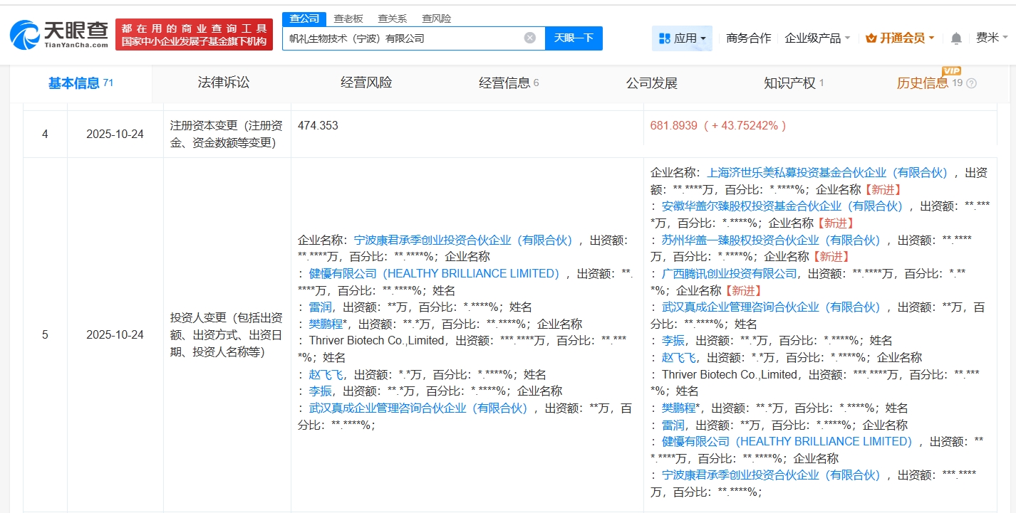 每經(jīng)AI快訊,天眼查App顯示,近日,帆禮生物技術(shù)(寧波)有限公司發(fā)生工商變更,新增廣西騰訊創(chuàng)業(yè)投資有限公司、上海濟(jì)世樂(lè)美私募投資基金合伙企業(yè)(有限合伙)為股東,注冊(cè)資本由約474萬(wàn)元增至約682萬(wàn)元,同時(shí),部分高管也發(fā)生變更。該公司成立于2023年10月,法定代表人為樊鵬程,經(jīng)營(yíng)范圍為醫(yī)學(xué)研究和試驗(yàn)發(fā)展,現(xiàn)由ThriverBiotechCo.,Limited、寧波康君承季創(chuàng)業(yè)投資合伙企業(yè)(有限合伙)及上述新增股東等共同持股。