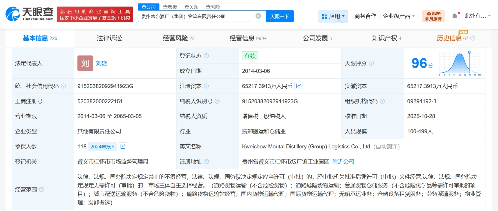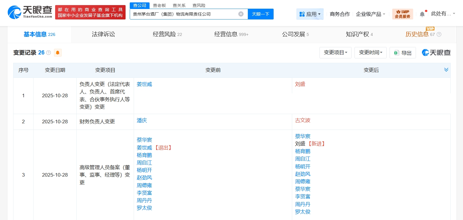 每經AI快訊,天眼查App顯示,近日,貴州茅臺酒廠(集團)物流有限責任公司發生工商變更,姜世威卸任法定代表人、董事長,由劉盛接任并擔任董事,同時,多位高管均發生變更。該公司成立于2014年3月,注冊資本約6.5億元,經營范圍含道路貨物運輸、道路危險貨物運輸、普通貨物倉儲服務、城市配送運輸服務、道路貨物運輸站經營、國內貨物運輸代理、無船承運業務、勞務派遣服務等。股東信息顯示,該公司由中國貴州茅臺酒廠(集團)有限責任公司、中國物流股份有限公司、仁懷醬酒(集團)有限責任公司共同持股。