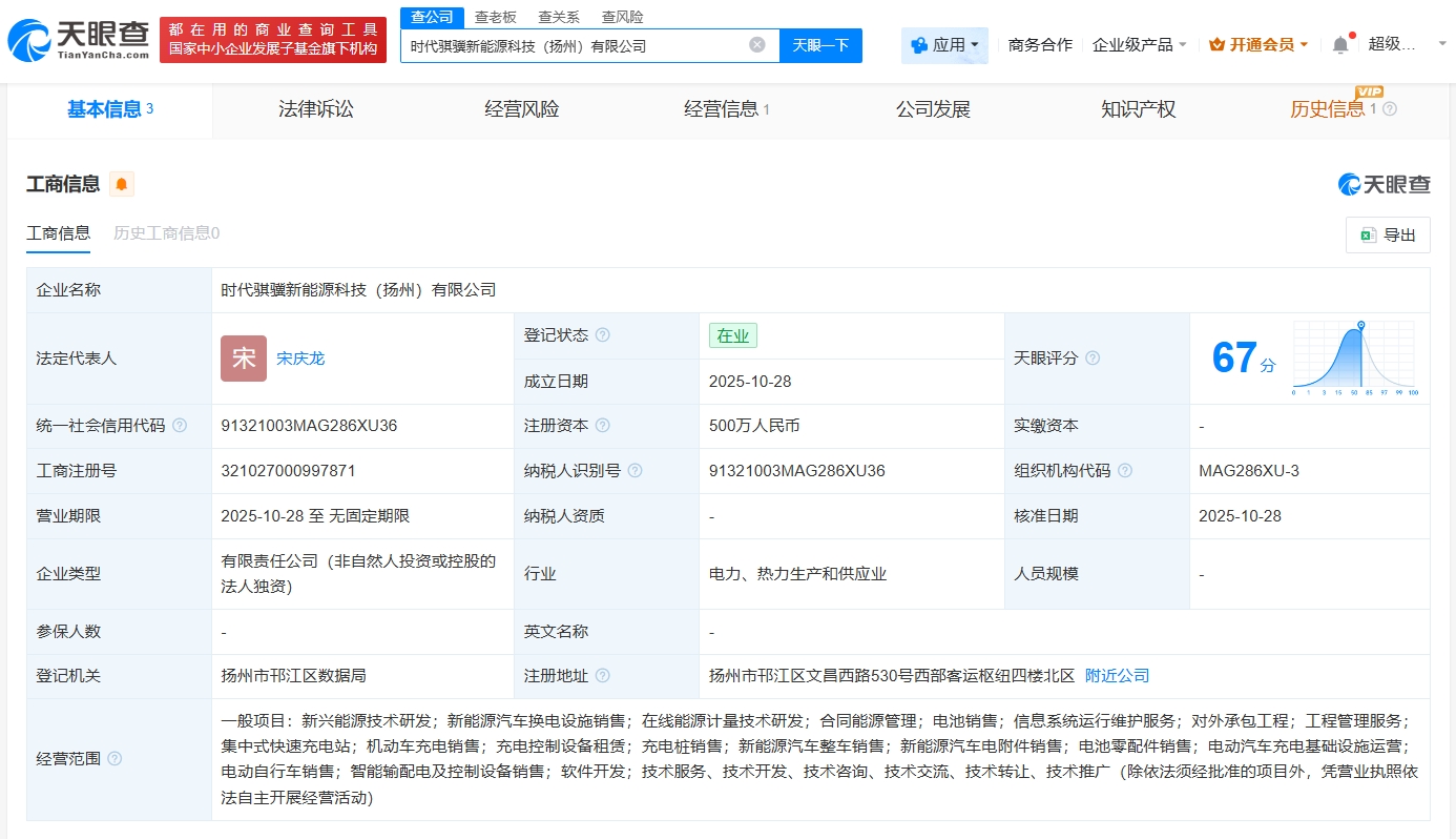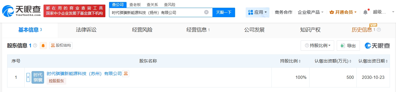 每經(jīng)AI快訊,天眼查App顯示,近日,時(shí)代騏驥新能源科技(揚(yáng)州)有限公司成立,法定代表人為宋慶龍,注冊(cè)資本500萬(wàn)元人民幣,經(jīng)營(yíng)范圍包括新興能源技術(shù)研發(fā)、新能源汽車換電設(shè)施銷售、合同能源管理、電池銷售等。股東信息顯示,該公司由寧德時(shí)代旗下時(shí)代騏驥新能源科技(蘇州)有限公司全資持股。