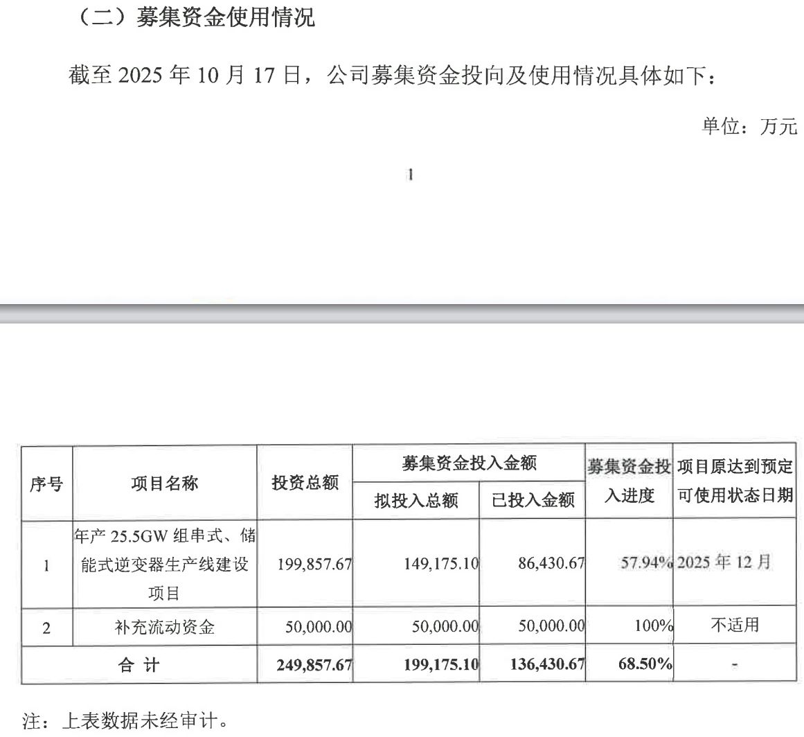 公開資料顯示,2023年,德業股份通過定增募資20億元,用于“年產25.5GW組串式、儲能式逆變器生產線建設項目”和補充流動資金。其中,“年產25.5GW組串式、儲能式逆變器生產線建設項目”投資總額19.99億元,募集資金擬投入總額14.92億元,項目原計劃達到預定可使用狀態日期為今年12月。