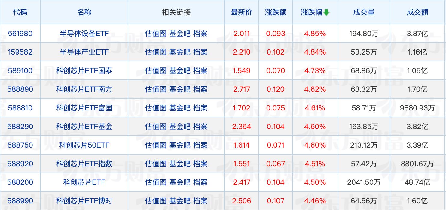 具體來看,半導體產業ETF領漲4.85%,科創芯片相關ETF全線走強。