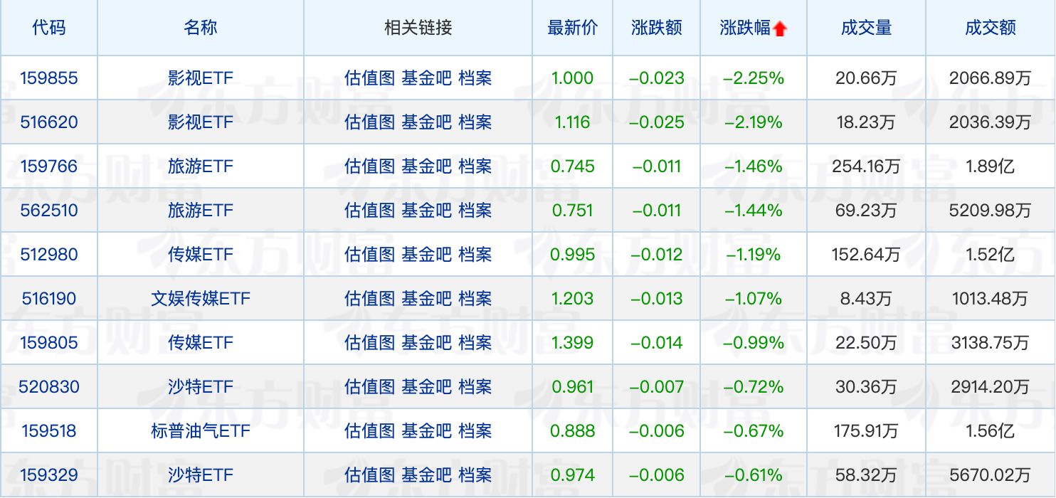 下跌方面,影視ETF領跌2.25%,游戲、文化傳媒相關ETF回調居前。