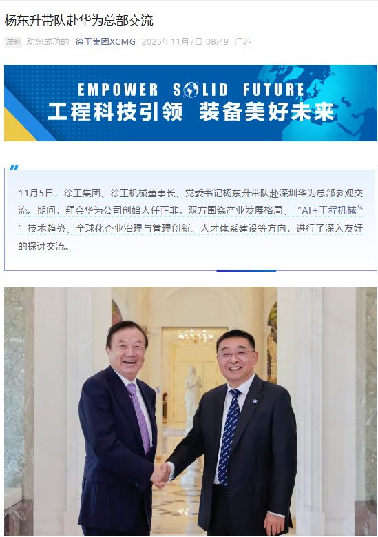 據徐工集團官方微信號11月7日消息,11月5日,徐工集團、徐工機械董事長、黨委書記楊東升帶隊赴深圳華為總部參觀交流。期間,拜會華為公司創始人任正非。雙方圍繞產業發展格局、“AI+工程機械”技術趨勢、全球化企業治理與管理創新、人才體系建設等方向,進行了深入友好的探討交流。