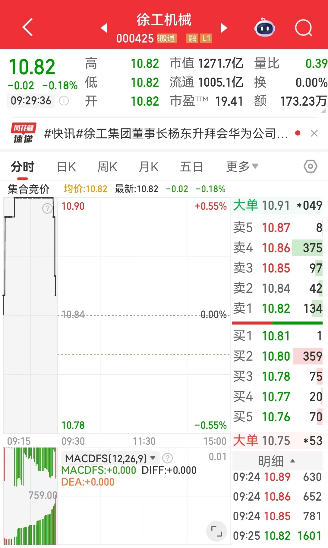 截至11月7日發稿,徐工機械(SH000425)報10.82元,跌幅0.18%,市值1271.7億元。