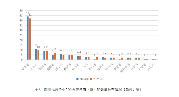各地也紛紛打出“組合拳”,激活民營經濟新動能。從區域分布來看,百強企業分布于全省16個市(州),其中,成都、宜賓、德陽上榜企業數量位居前三名,分別是42家、10家、9家,綿陽、眉山較上年各增加2家。