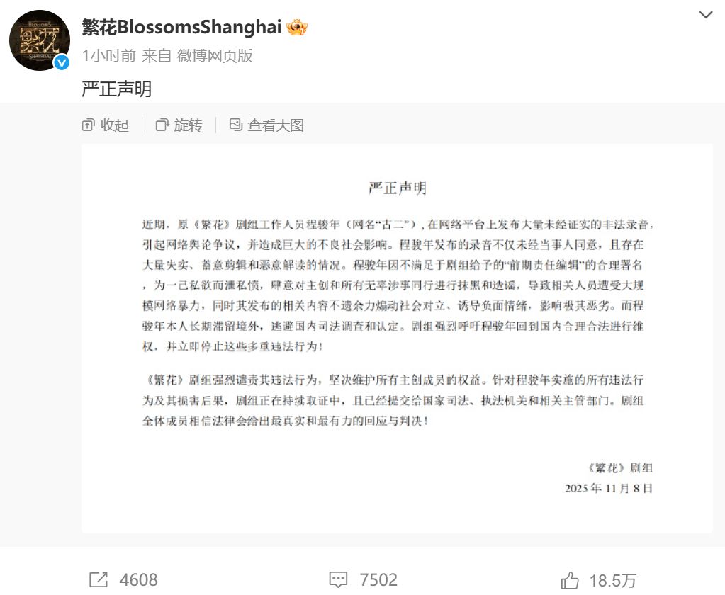 11月8日,《繁花》劇組發布聲明:近期,原《繁花》劇組工作人員程駿年(網名“古二”),在網絡平臺上發布大量未經證實的非法錄音引起網絡輿論爭議,并造成巨大的不良社會影響。程駿年發布的錄音不僅未經當事人同意,且存在大量失實、蓄意剪輯和惡意解讀的情況。