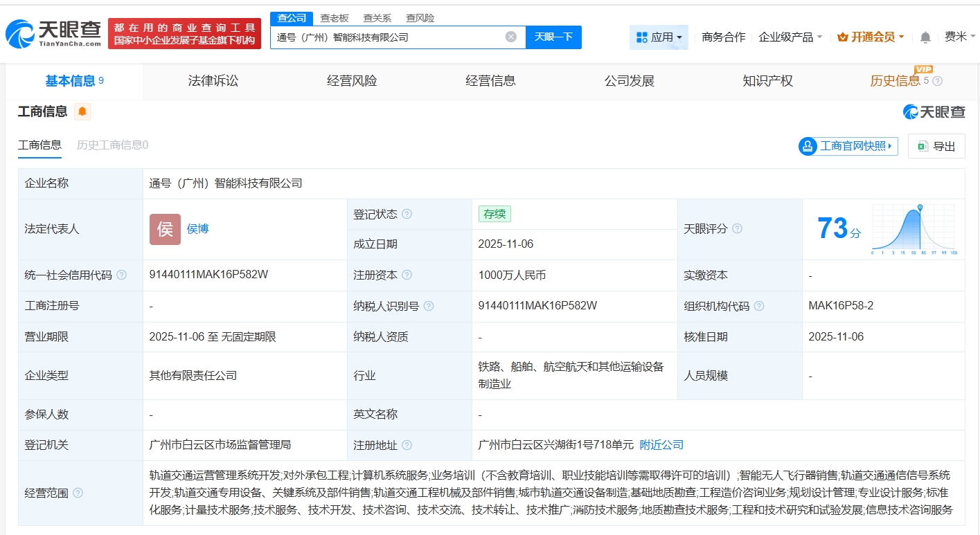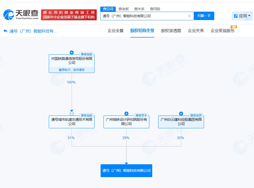 每經AI快訊,天眼查工商信息顯示,近日,通號(廣州)智能科技有限公司成立,法定代表人為侯博,注冊資本1000萬元人民幣,經營范圍包括軌道交通運營管理系統開發、對外承包工程、計算機系統服務等。股權全景穿透圖顯示,該公司由中國通號(688009)旗下通號城市軌道交通技術有限公司、地鐵設計(003013)、廣州白云建科控股集團有限公司共同持股。