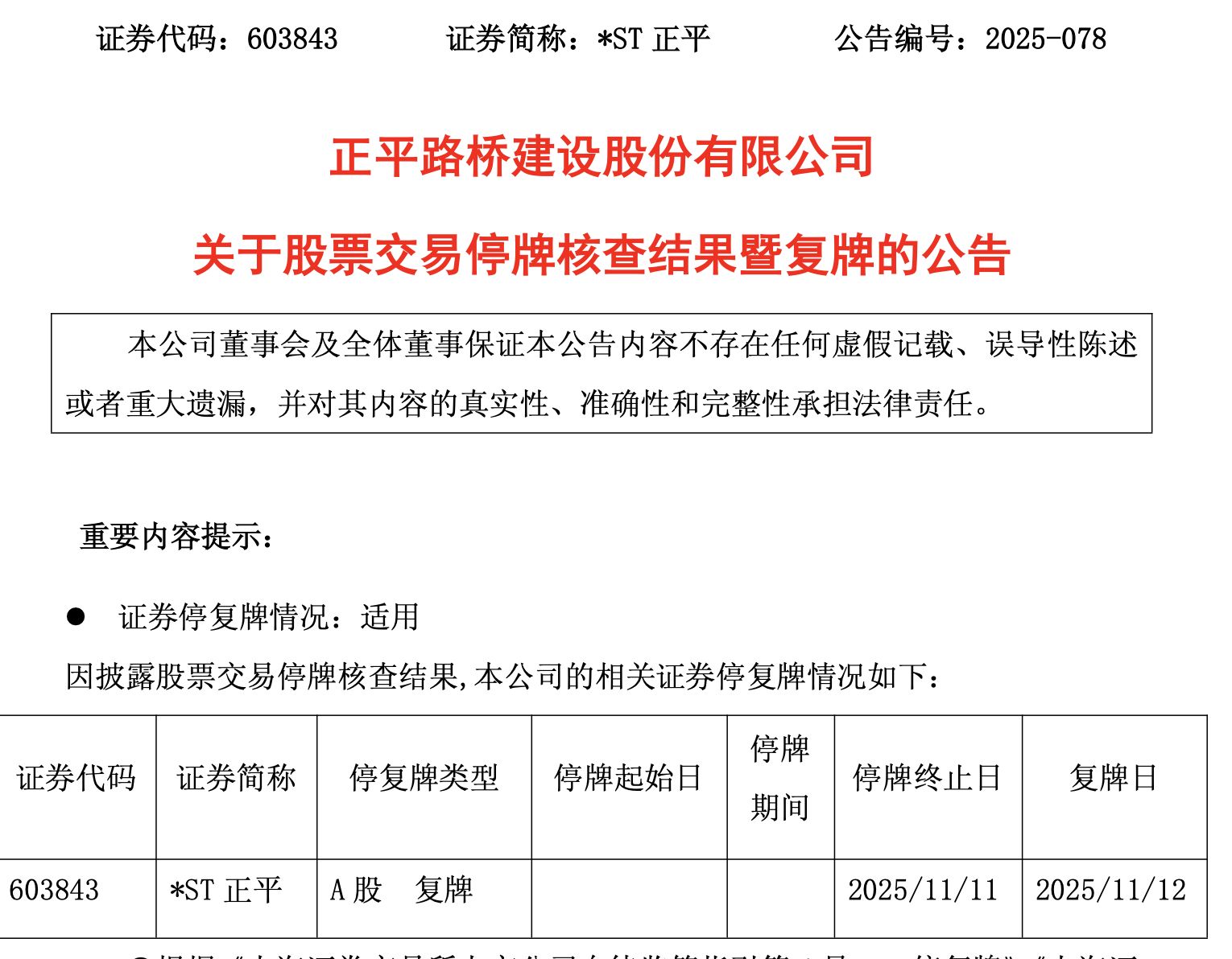 11月11日晚,*ST正平(603843.SH)公告稱,近日,公司就股票交易情況進(jìn)行核查,鑒于相關(guān)核查工作已完成,經(jīng)申請,公司股票將于11月12日開市起復(fù)牌。經(jīng)自查,公司目前生產(chǎn)經(jīng)營情況正常,未發(fā)生重大變化,未發(fā)現(xiàn)其他可能對公司股價(jià)產(chǎn)生較大影響的重大事件;不存在應(yīng)披露而未披露的重大信息。