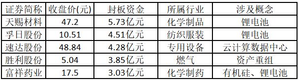從封板資金來看,今日漲停板個股中,封板資金排名前5的個股包括天賜材料、孚日股份、速達股份、勝利股份、富祥藥業。