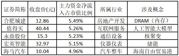 主力資金凈流入金額占市值比例排名前5的個股分別為合肥城建、值得買、永鼎股份、宏英智能、海馬汽車。歡迎大家關注微信公眾號“道達號”,其“道達漲停復盤”欄目為大家解讀。