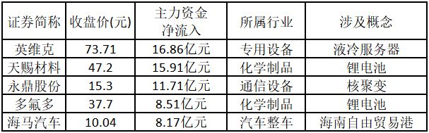 從主力資金來看,今日漲停板個股中,主力資金凈流入金額排名前5的個股分別為英維克、天賜材料、永鼎股份、多氟多、海馬汽車。