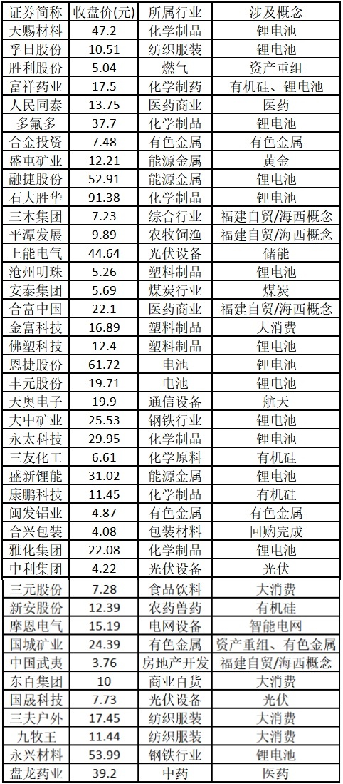 漲停板個股中,股價創出近一年新高的個股有41只(不包括創出歷史新高的個股),包括天賜材料、孚日股份、勝利股份、富祥藥業、人民同泰、多氟多、合金投資、盛屯礦業、融捷股份、石大勝華、三木集團、平潭發展、上能電氣、滄州明珠、安泰集團、合富中國、金富科技、佛塑科技、恩捷股份、豐元股份、天奧電子、大中礦業、永太科技、三友化工、盛新鋰能、康鵬科技、閩發鋁業、合興包裝、雅化集團、中利集團、三元股份、新安股份、摩恩電氣、國城礦業、中國武夷、東百集團、國晟科技、三夫戶外、九牧王、永興材料、盤龍藥業,具體如下表所示。
