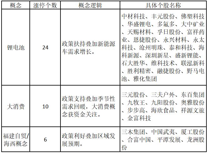 從概念特征來看,今日漲停板個股中,鋰電池、大消費、福建自貿/海西概念的個股最多。