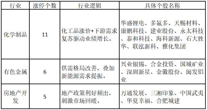 從行業特征來看,今日漲停板個股中,化學制品、有色金屬、房地產開發行業的個股最多。