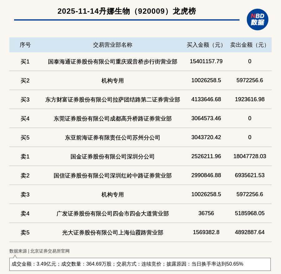 每經訊,2025年11月14日,北交所上市公司丹娜生物(920009,收盤價:94.79元)登上龍虎榜,交易方式是連續競價,披露原因是當日換手率達到50.65%,成交數量364.69萬股,成交金額3.49億元。買一席位為國泰海通證券股份有限公司重慶觀音橋步行街營業部,買入1540.12萬元;賣一席位為國金證券股份有限公司深圳分公司,賣出1804.77萬元。