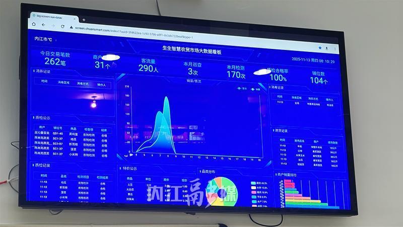 11月13日清晨,在內江市中區新光北路的一座農貿市場內,前來買菜的市民紛紛圍攏在一塊電子屏幕前,盯著屏幕上實時滾動播報的當日蔬菜、肉類、水產參考價,以及最新農殘快檢結果。“白菜合格”“黃瓜合格”等字樣,讓不少人放心點頭。這家開業不滿一個月的農貿市場,憑著無處不在的“科技感”,徹底打破了傳統農貿市場“靠經驗選菜、憑信任消費”的舊模式,成為周邊居民“買得安心、用得省心”的“買菜新地標”。