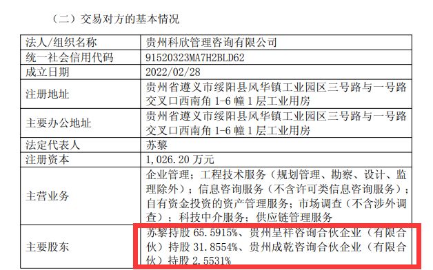 貴州科欣股東包括蘇黎、貴州呈祥咨詢合伙企業(yè)(有限合伙)(以下簡(jiǎn)稱貴州呈祥)、貴州成乾咨詢合伙企業(yè)(有限合伙)(以下簡(jiǎn)稱貴州成乾)。
