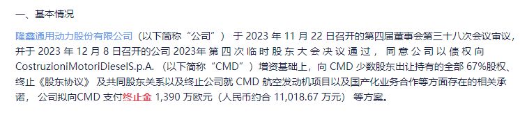 隆鑫通用還在2017年以4111萬歐元(約合人民幣3.04億元)收購(gòu)意大利CMD公司67%的股權(quán)。然而,在意大利CMD公司未實(shí)現(xiàn)航空發(fā)動(dòng)機(jī)產(chǎn)品銷售、航空發(fā)動(dòng)機(jī)技術(shù)國(guó)產(chǎn)化計(jì)劃未達(dá)預(yù)期的情況下,隆鑫通用在202312月擬以100萬歐元(約合人民幣793萬元)價(jià)格轉(zhuǎn)讓意大利CMD公司67%股權(quán),同時(shí)支付1390萬歐元(約合人民幣1.10億元)的終止金,目前上述交易仍在推進(jìn)中。