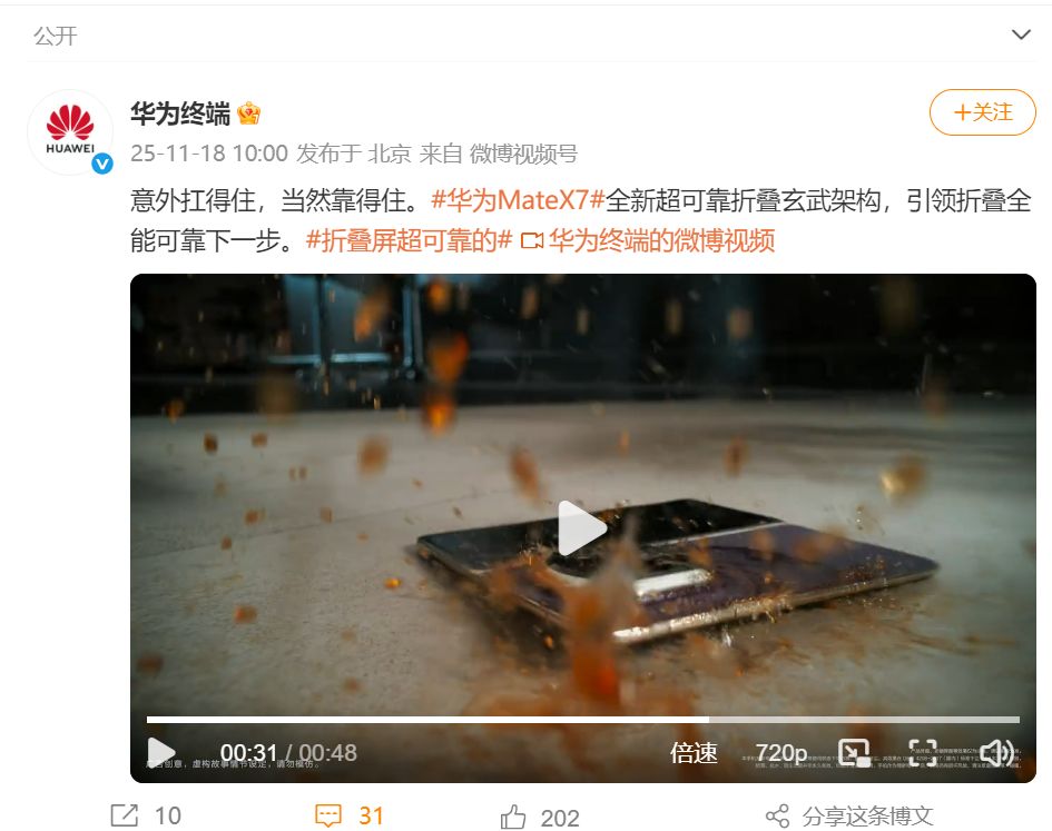 11月18日,華為常務(wù)董事、產(chǎn)品投資委員會主任、終端BG董事長余承東在微博發(fā)帖正式公布華為Mate X7真機。