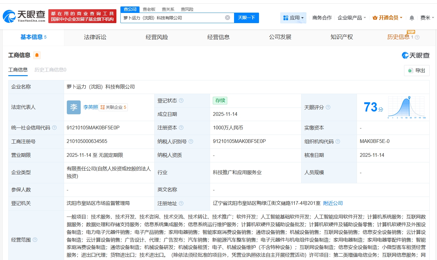 每經(jīng)AI快訊,天眼查工商信息顯示,近日,蘿卜運力(沈陽)科技有限公司成立,法定代表人為李英照,注冊資本1000萬元人民幣,經(jīng)營范圍包括人工智能基礎(chǔ)軟件開發(fā)、人工智能應(yīng)用軟件開發(fā)、計算機系統(tǒng)服務(wù)等。股東信息顯示,該公司由蘿卜快跑關(guān)聯(lián)公司蘿卜運力(北京)科技有限公司全資持股。