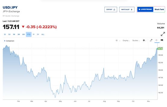這一龐大的刺激計(jì)劃此前已引發(fā)了市場(chǎng)對(duì)日本財(cái)政狀況惡化的擔(dān)憂,日元匯率與日本國(guó)債本月幾乎同步大跌。盡管11月21日刺激計(jì)劃正式公布后,美元兌日元小幅回落,短暫走低至157.20,但隨后再度反彈,逼近可能觸發(fā)日本央行干預(yù)的區(qū)間。自從9月以來(lái),日元已在G10貨幣中領(lǐng)跌;日本10年期國(guó)債收益率本周早些時(shí)候也進(jìn)一步躍升至了17年來(lái)的最高位。