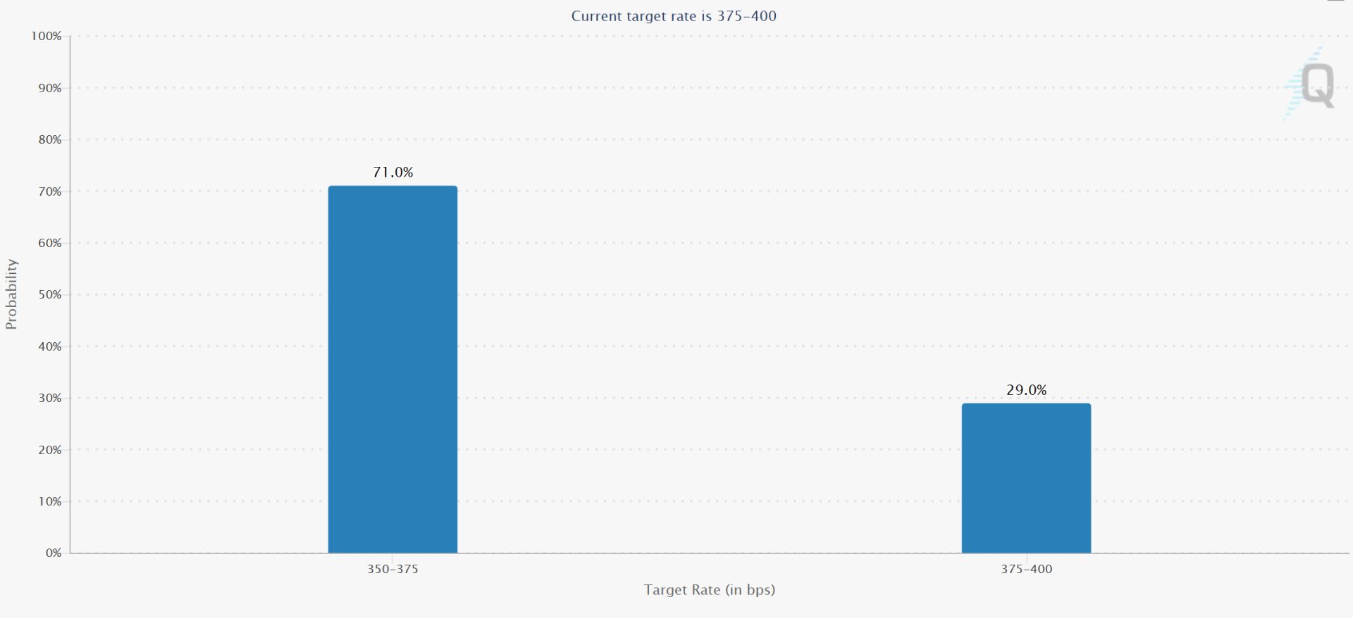 威廉姆斯發(fā)表講話后,CME FedWatch數(shù)據(jù)顯示,市場(chǎng)預(yù)期美聯(lián)儲(chǔ)12月降息25個(gè)基點(diǎn)的概率為71%,較前日不到40%的概率大幅攀升。