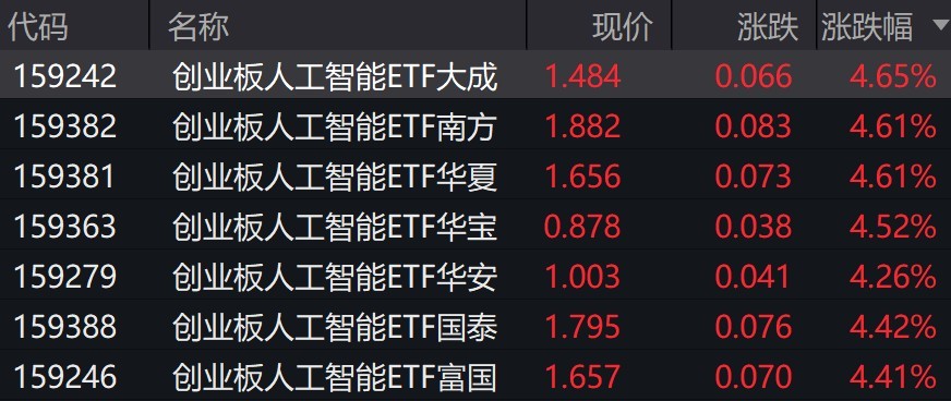 受盤面影響,創(chuàng)業(yè)板人工智能ETF漲超4%。