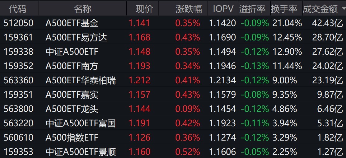 截至上午收盤,場內跟蹤中證A500指數的ETF小幅上漲。其中,有10只中證A500相關ETF成交額超1億元,3只超27億元。A500ETF基金、A500ETF易方達、中證A500ETF早盤成交額分別為42.43億元、28.7億元、27.62億元。