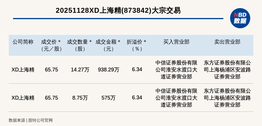 每經訊,2025年11月28日,新三板基礎層公司XD上海精(873842,收盤價:61.83元)發生2筆大宗交易,總成交金額為1513.28萬元,成交金額最高的一筆成交價65.75元/股,成交數量14.27萬股,成交金額938.29萬元,溢價6.34%。買入營業部是中信證券股份有限公司淮安水渡口大道證券營業部,賣出營業部是東方證券股份有限公司上海楊浦區安波路證券營業部。