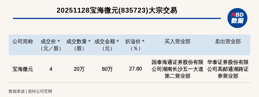 每經訊,2025年11月28日,新三板創新層公司寶海微元(835723,收盤價:3.13元)發生一筆大宗交易,成交價4元/股,成交數量20萬股,成交金額80萬元,溢價27.8%。買入營業部是國泰海通證券股份有限公司湖南長沙五一大道第二營業部,賣出營業部是華泰證券股份有限公司高郵通湖路證券營業部。