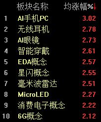 板塊方面,屏下攝像、衛星互聯網、消費電子、AI手機、6G概念等漲幅居前,電源設備、DRG/DIP、風電設備表現不佳,領跌市場。