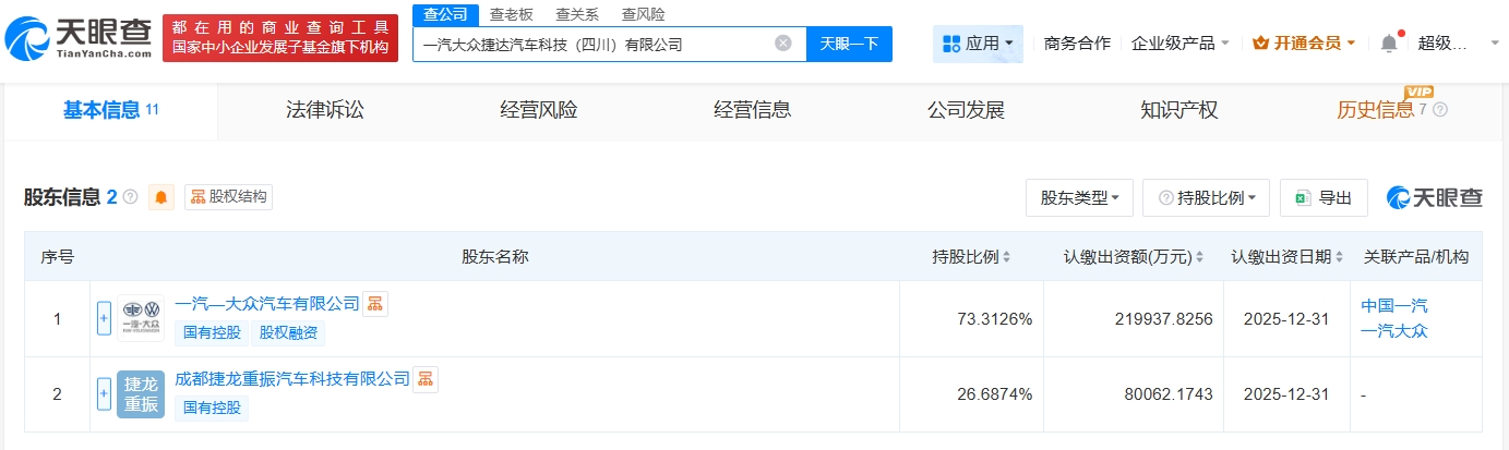 每經AI快訊,天眼查工商信息顯示,近日,一汽大眾捷達汽車科技(四川)有限公司成立,法定代表人為聶強,注冊資本30億元人民幣,經營范圍包括汽車零部件及配件制造、電動機制造、智能車載設備制造、道路機動車輛生產等。股東信息顯示,該公司由一汽—大眾汽車有限公司、成都捷龍重振汽車科技有限公司共同持股。