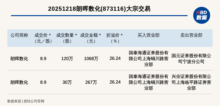 每經訊,2025年12月18日,新三板創新層公司朗暉數化(873116,收盤價:7.05元)發生2筆大宗交易,總成交金額為1335萬元,成交金額最高的一筆成交價8.9元/股,成交數量120萬股,成交金額1068萬元,溢價26.24%。買入營業部是國泰海通證券股份有限公司上海銅川路營業部,賣出營業部是國元證券股份有限公司寧波分公司。