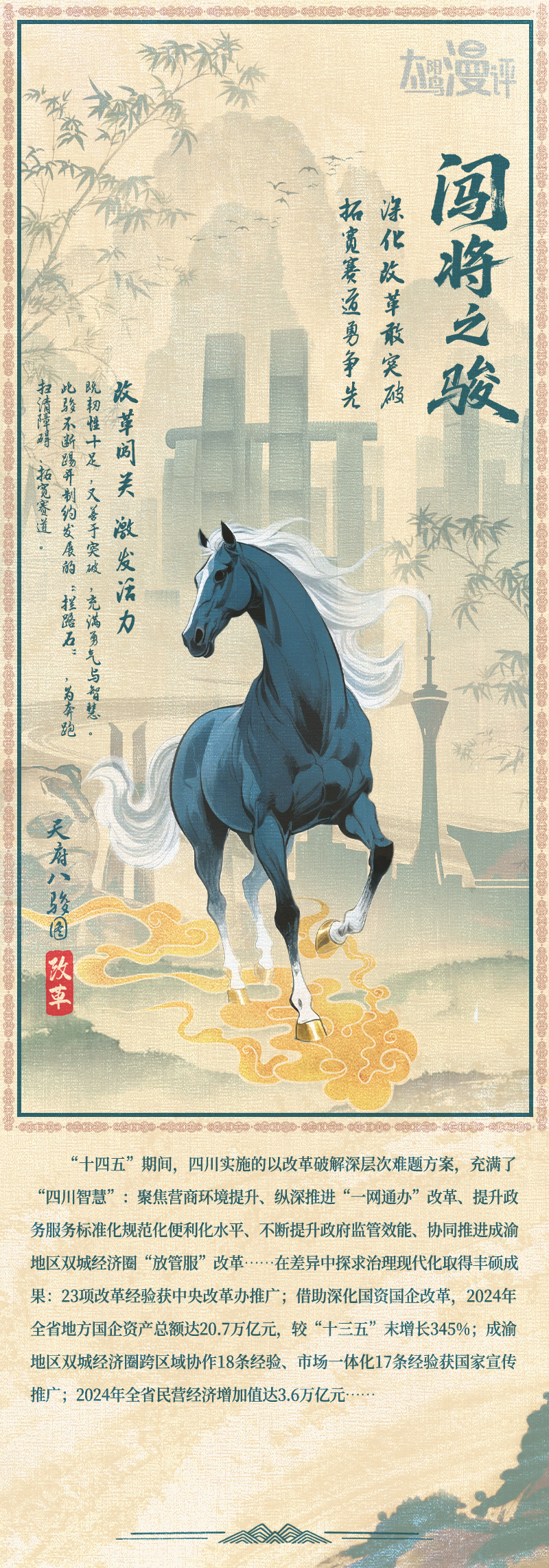 “十四五”期間,四川實施的以改革破解深層次難題方案,充滿了“四川智慧”:聚焦營商環境提升、縱深推進“一網通辦”改革、提升政務服務標準化規范化便利化水平、不斷提升政府監管效能、協同推進成渝地區雙城經濟圈“放管服”改革……在差異中探求治理現代化取得豐碩成果:23項改革經驗獲中央改革辦推廣;借助深化國資國企改革,2024年全省地方國企資產總額達20.7萬億元,較“十三五”末增長345%;成渝地區雙城經濟圈跨區域協作18條經驗、市場一體化17條經驗獲國家宣傳推廣;2024年全省民營經濟增加值達3.6萬億元……