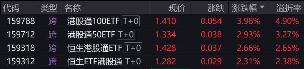 多只港股相關ETF早盤大幅上漲,港股通100ETF漲約4%,港股通50ETF漲約3%,但溢價均超3%。