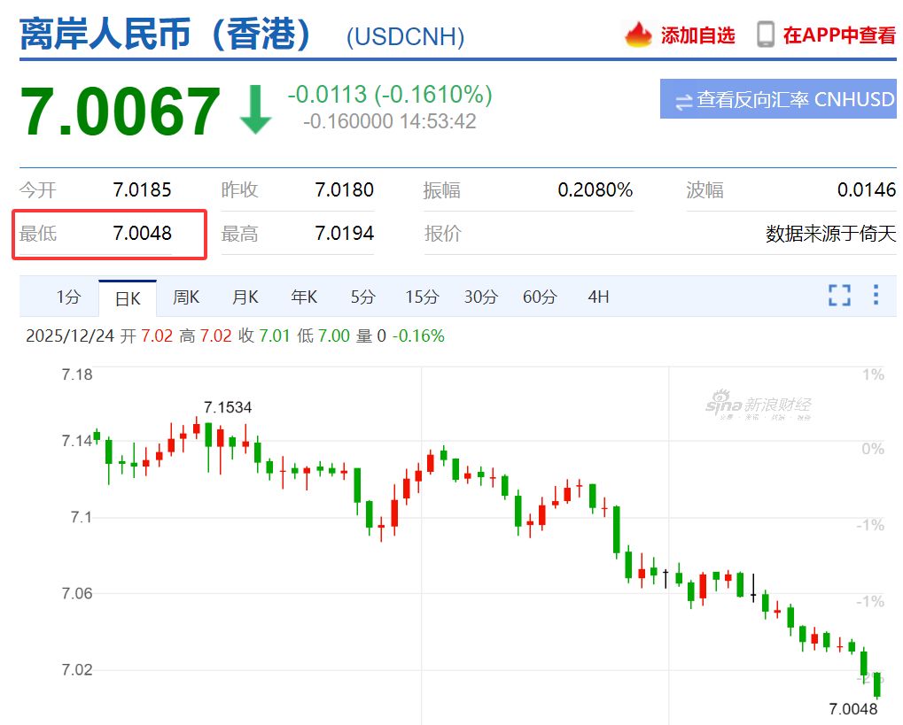 12月23日,離岸人民幣對美元率先升破7.02關口,為2024年10月以來首次。