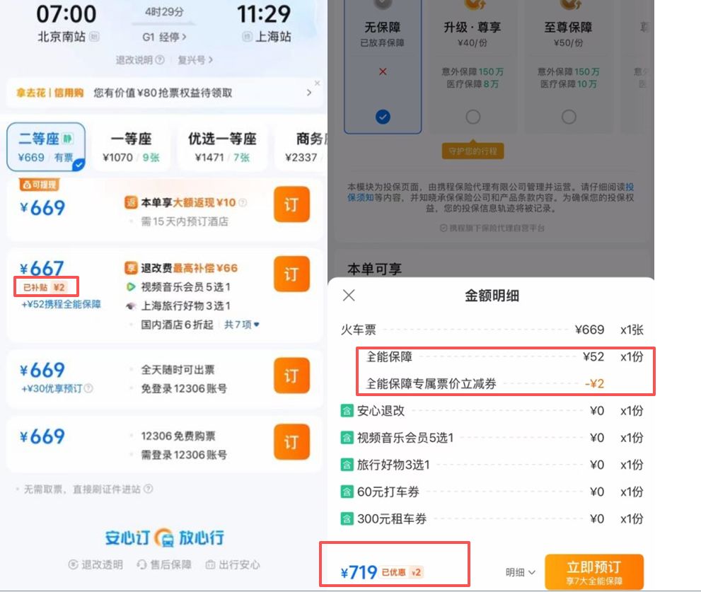 帶著疑惑,記者點擊展開費用明細后才發現,總價中包含了一項52元的“全能保障”服務費用。而此前頁面提示的2元補貼券,實際僅能用于抵扣該項保障費用(實際價格為50元),并不能用于減免火車票本身價格。