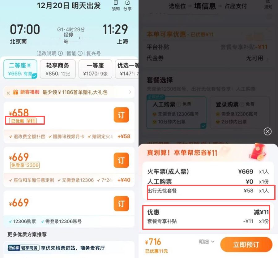 在另一在線旅游平臺的小程序上,每經記者選擇了相同時段北京至上海的火車票,訂票頁面顯示最低票價為658元,其中用小字注明包含“11元優惠券”。但當記者點擊進入付款頁面后,最終結算總價卻變為716元。