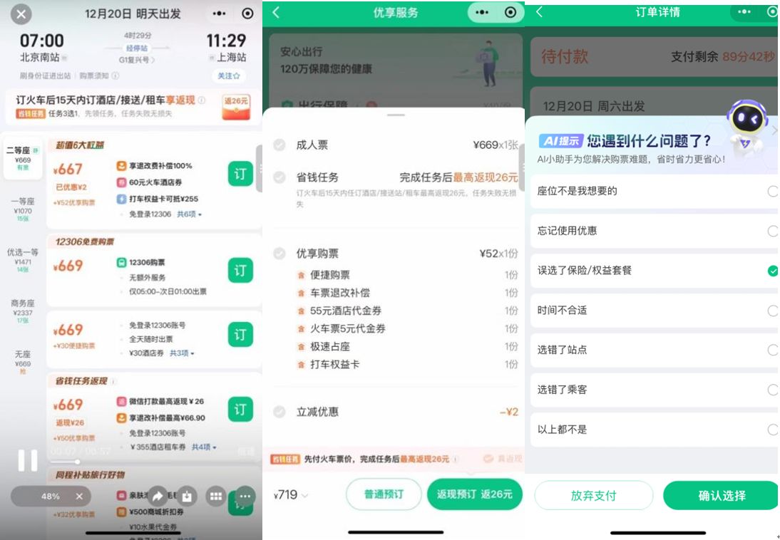 為驗證此類界面設計是否存在行業普遍性,記者又選取另一在線旅游平臺進行測試。在預訂相同班次車票時,該平臺首頁同樣將捆綁套餐的選項顯示為最低票價。進入結算頁面后,搭售產品也被默認添加至訂單。記者嘗試取消此次訂票,但整個過程需依次點擊“取消”、選擇取消原因,再點擊“確認選擇”,方能完成操作。從進入平臺開始購票到成功取消訂票,整個流程耗時約5分鐘。