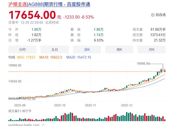 國際銀價大幅上漲,國內白銀也創新高。12月29日開盤后,滬銀主力合約只是小幅回踩便再次向上突破,創下19998元/千克的歷史新高。