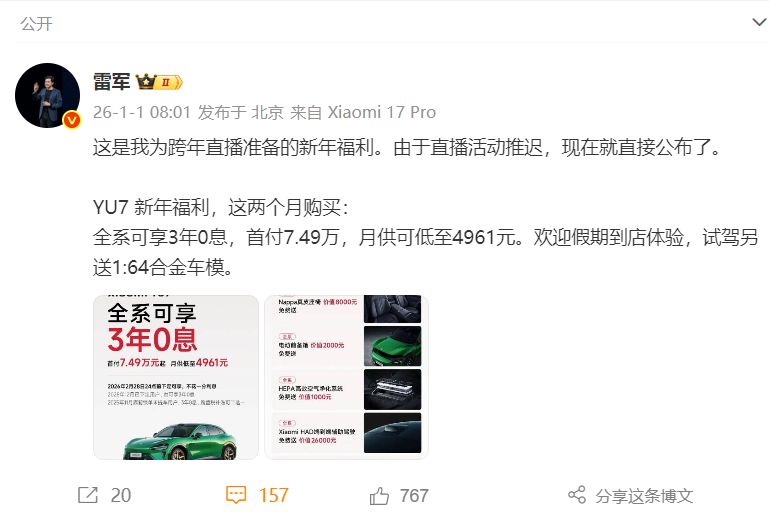 2026年1月1日,雷軍在其微博發文稱:“這是我為跨年直播準備的新年福利。由于直播活動推遲,現在就直接公布了。 YU7 新年福利,這兩個月購買, 全系可享3年0息,首付7.49萬,月供可低至4961元。歡迎假期到店體驗,試駕另送1:64合金車模。”