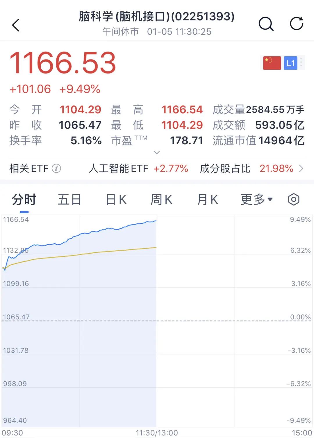 1月5日早盤(pán)市場(chǎng)高開(kāi)高走,上證指數(shù)時(shí)隔34個(gè)交易日重回4000點(diǎn),創(chuàng)業(yè)板指漲超2%,滬深兩市半日成交額顯著放量。盤(pán)面上,半導(dǎo)體產(chǎn)業(yè)鏈和腦機(jī)接口概念表現(xiàn)活躍,多只個(gè)股漲停。馬斯克稱“神經(jīng)連接”2026年將大規(guī)模生產(chǎn)腦機(jī)接口設(shè)備,Merge Labs正分拆專注超聲波讀取腦部活動(dòng),開(kāi)源證券認(rèn)為腦機(jī)接口技術(shù)預(yù)計(jì)2026年邁向商業(yè)化。