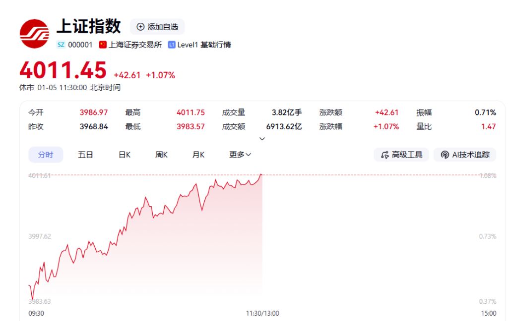 1月5日早盤(pán),市場(chǎng)高開(kāi)高走。時(shí)隔34個(gè)交易日,上證指數(shù)盤(pán)中重回4000點(diǎn),創(chuàng)業(yè)板指漲超2%。滬深兩市半日成交額1.64萬(wàn)億元,較上個(gè)交易日放量3238億元。盤(pán)面上熱點(diǎn)快速輪動(dòng),全市場(chǎng)超4000只個(gè)股上漲,其中98只個(gè)股漲停。截至收盤(pán),滬指漲1.07%,深成指漲1.87%,創(chuàng)業(yè)板指漲2.15%。